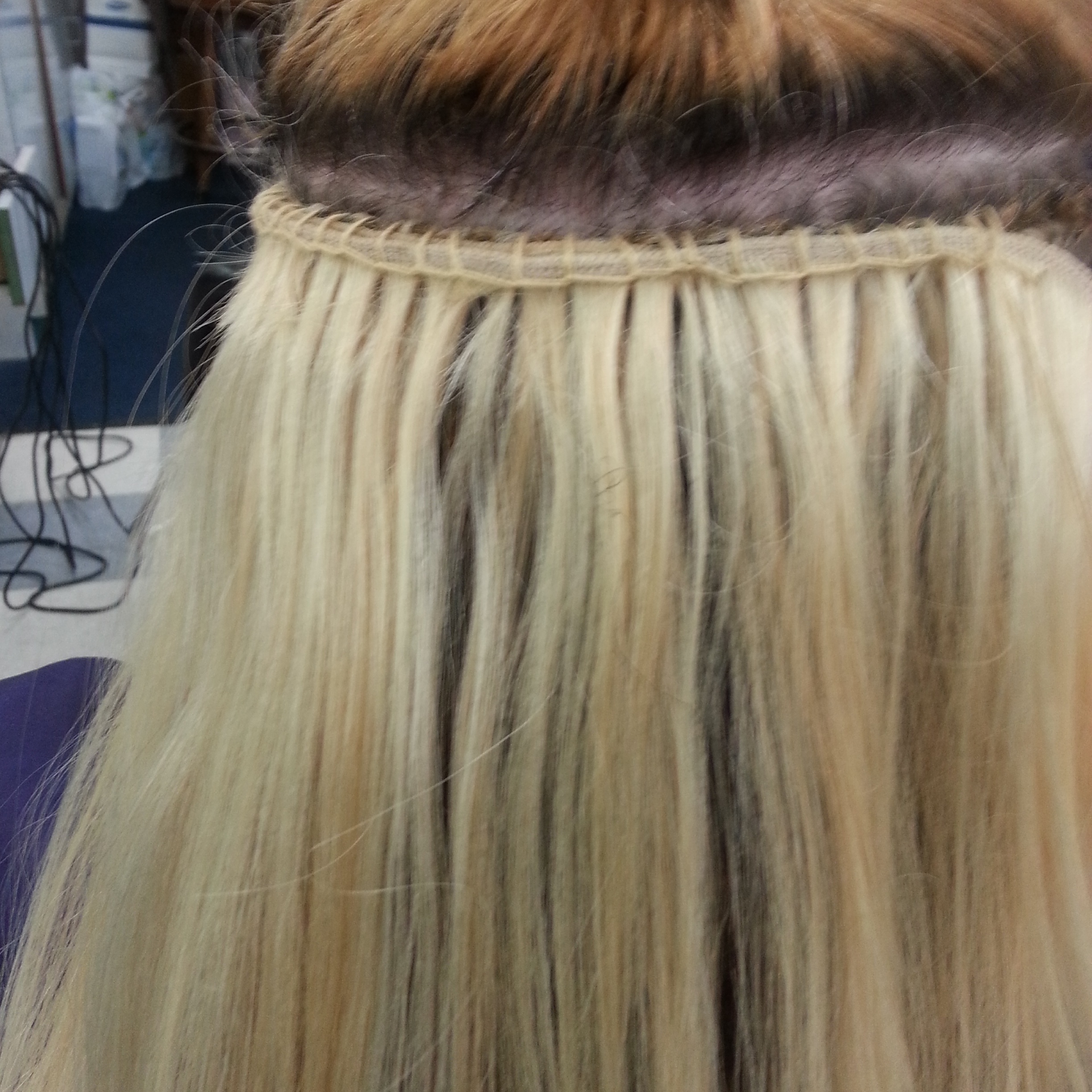 Here is a sneak peak of how I do hair extensions. I don’t use glue, staples etc. I do it the old school way that I learned back in the day. I take a piece of synthetic hair and braid into a tiny braid across the scalp. I then take the weftnif the hair and sew it on the braid. They synthetic hatlir makes the braid sturdy.