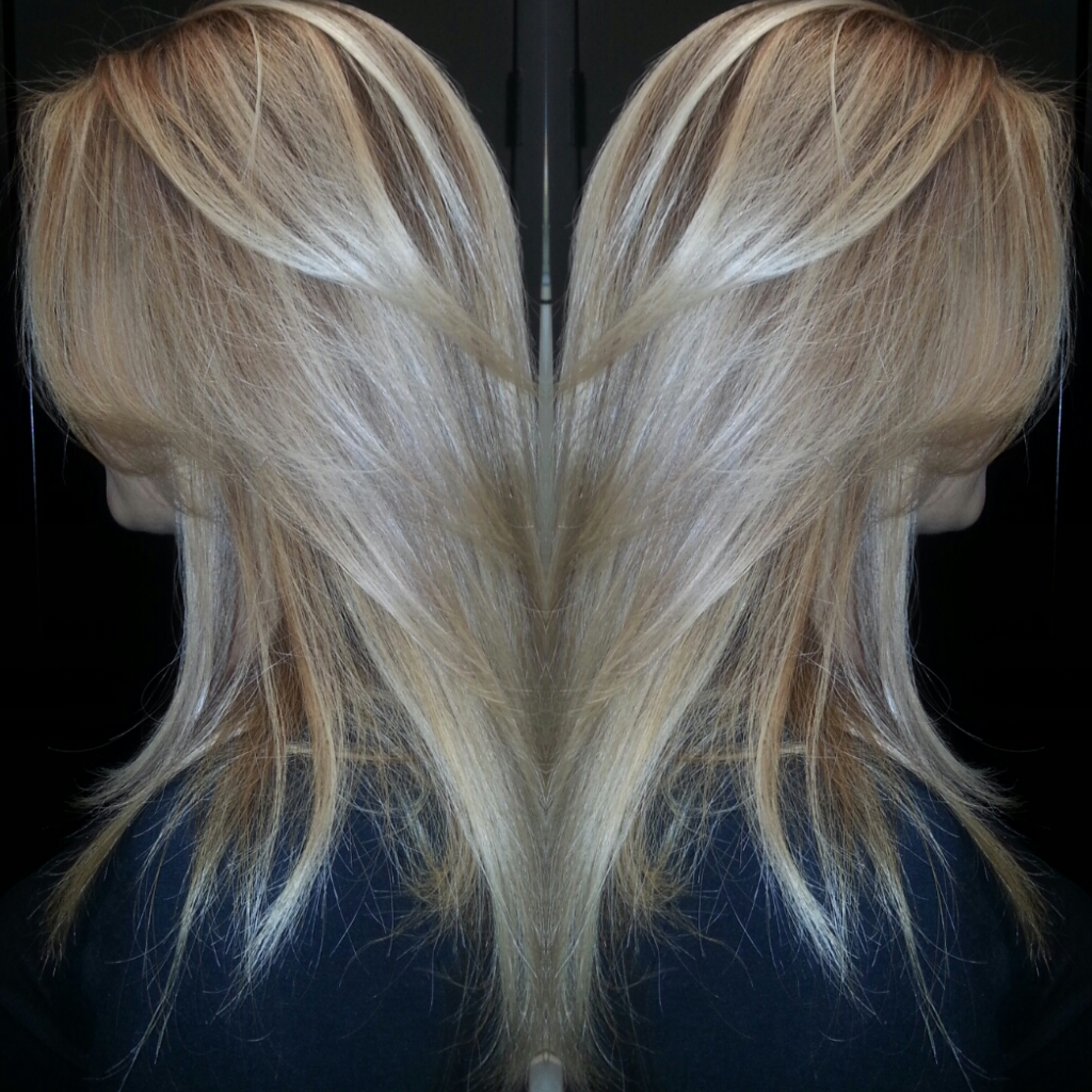 And so Susie comes in ..my high school guinea pig one of my first clients. I tried something different today. I did her balayage highlites while her roots were processing to kill some time. It all turns out well at the end but it was a castasthrope at the shampoo bowl..yikes!!! The highlights did not lift enough at the roots because I applied it on top of the color to make it look more natural…okay no big deal I can always add more highlites right….well thats not the end of it. I gave her a PM shines hairglosser by Paul Mitchell to tone her hair and make it shinny and soft…I used the glosser named *Titanium* it looked so pretty on the color chart…well her hair came out purple like Barney..a pretty violet shade.. I panicked a lil bit without letting her know. I used a clarying shampoo..then I did a shampoo cap..(bleach mixed with shampoo and peroxide) to try and pull Barney out. I left it on for 5 min…phew!! I told her that I was making her highlights lighter because it did not lift enough. She never questions me which makes my life easier…she said: “Okay Evy…and just laid back in the shampoo bowl. She never saw her Barney hair because she was laying at the shampoo bowl …hehe…..well this is how it turned out. Tada!!! She loved it!!! Next time I will dilute the PM Shines glosser with clear.
