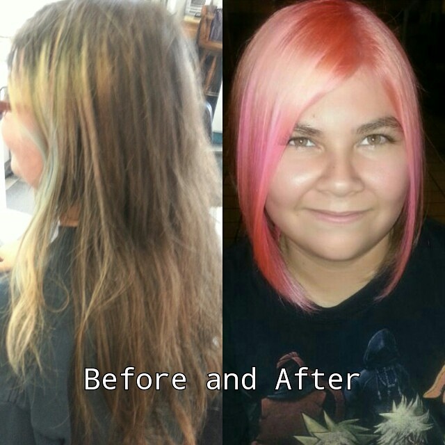 I did her hair last night I love doing teens’ hair, they challenge me to take it to the next level. I cut rebleached and colored it. We decided to keep it pink for a while. I will have her come in the next couple of weeks to recolor it and stain the hair some more. Its best to use a non sulfate shampoo, don’t shampoo it every single day for longer lasting results.