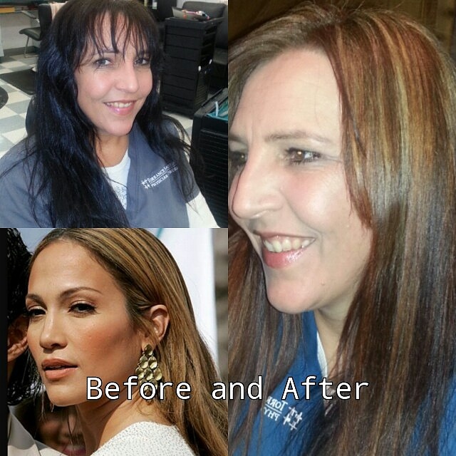 My client Sherry came to me two months ago with boxed dyed hair. She had been coloring her hair black for years. She wanted Jlo’s color. I was hoping and praying that she would be patient and not give up. Many ladies get fed up by the third session. Good hair color does not happen over night. It’s a patient process. This was her third session I was able to achieve Jlo’s color with this new product called *Blondme* its a keratin pre lifter to protect the hair before you start a bleach or color process. Once you go black..well you know the rest..LOL… Its a hard color to get out of the hair..phew!