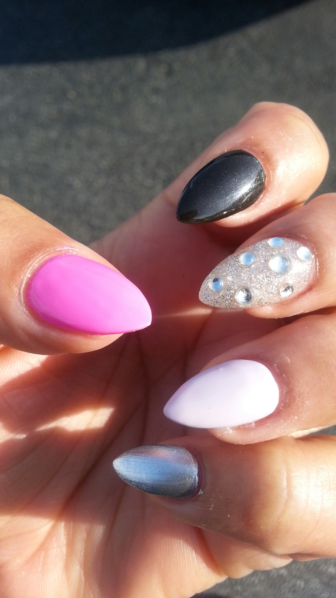 I ask my nail guy to to different things to my nails. He doesn’t mind. I want to market him as much as possible. He’s not really into marketing himself on social media he doesn’t have time for all that. He’s a busy guy. So far I got him started on a Instagram page. He has some followers. I just need to teach him how to take good pictures and hastag himself. Taking pictures is no joke (its hard) I give better shampoos with my pointy nails. I came up with the different color idea and he decided to add on the fake diamonds. My goal is to get 100 hundred likes on one of his pictures Instagram pictures. Keep trying till you get it right💅