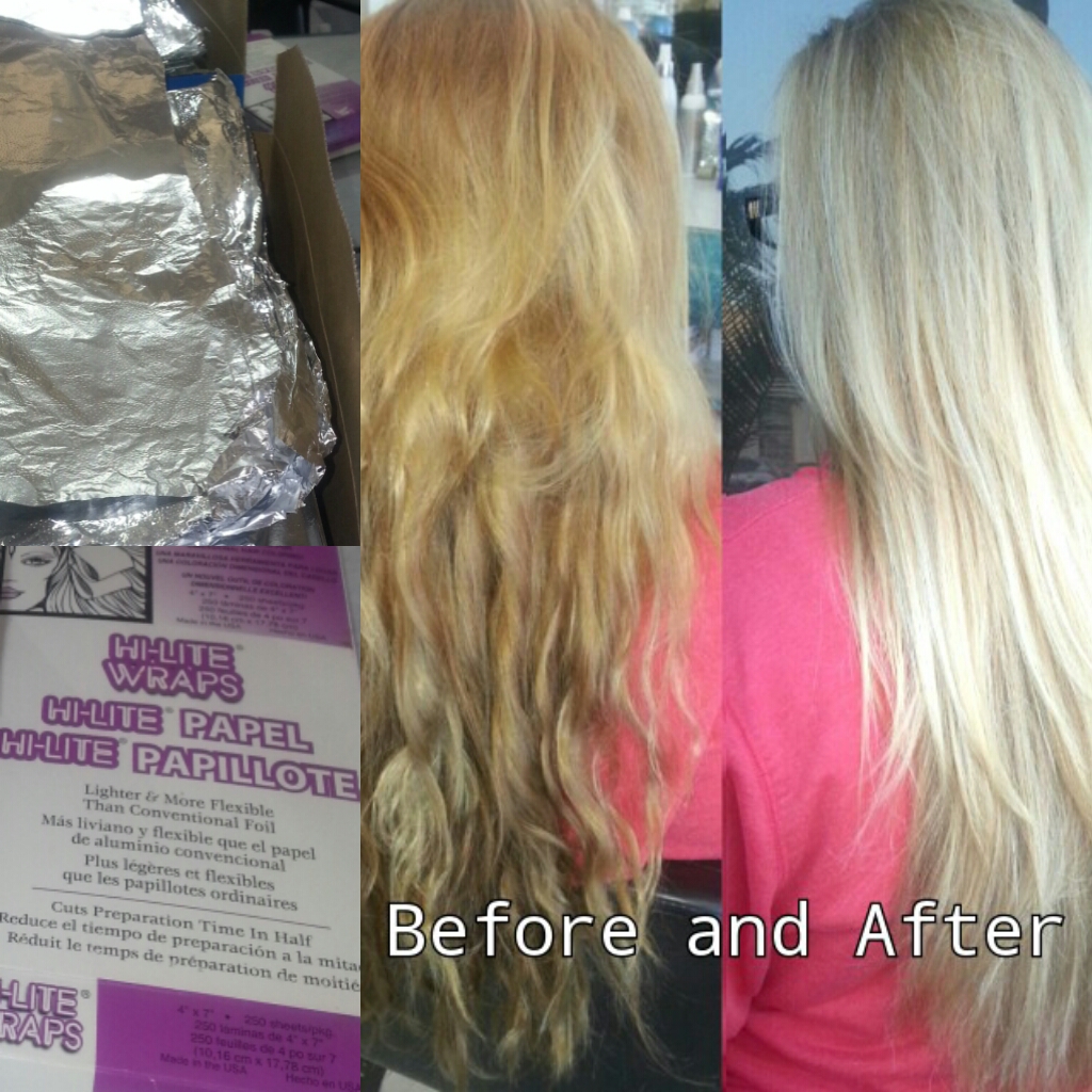 Okay and so yesterday I was too beat to finish telling you what I did. Tina wanted to go blonder she colored her hair on her own and it turned out a army green. It looked worse in person. The flash on my cell pulled some of the green out. I stopped using foils about a year ago I use the *Hi-lite wax paper* because her hair is so long I had to use foils. The foils are longer than the wax paper. I like the foils but when you use it with bleach they get hot sometimes and burn the scalp. Clients can feel the heat even when you don’t put them under the dryer. This was the final result. She was a happy camper which makes me happy as well. I won’t be tossing and turning at all this week.:D