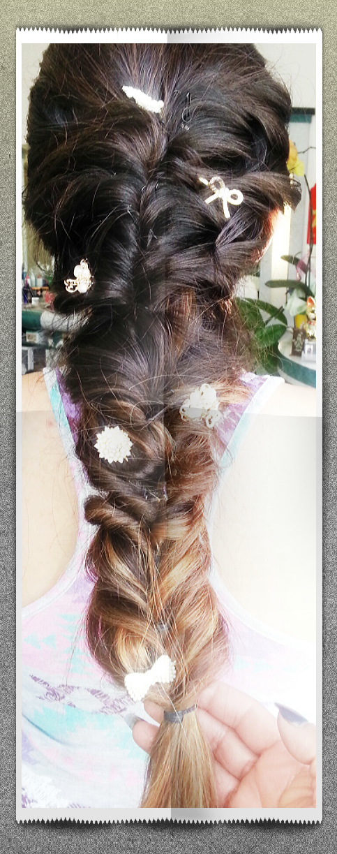 I was so busy at work today. I even got to see Stacy from Australia. She moved there, came back on vacation and had me do her highlites. I will post those pictures tomorrow. It was so nice seeing her…but my proudest momment was doing Kaciee’s updo today. She is one of my hair models. I haven’t seen her in months. She asked me to do this updo she had seen on a Instagram video. It doesn’t look exactly the same but pretty close, except the girl in the video had a vine of flowers in her hair. We didn’t know where to go get a vine of flowers and so we used cute fancy barets instead. I wanted to play with her hair some more but my clients were walking in. Hopefully next time. I want to do the flowers and all!!
