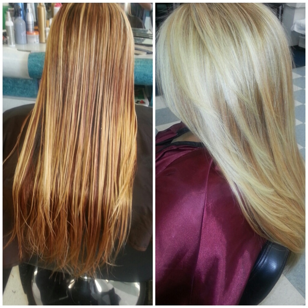 Christina has wore her hair a deep red for a couple of years and decided to go blond. The picture on the left is probably after the 4th session. Its been taking a long time to get it real blond because hair is down to her waist and super thick. Thank goodness she is very patient. ..phew!…..LOL I got her super blond today, it will get blonder after two weeks. The first two weeks the hair is real rich on color but after shampooing it a lot it fades. In this case it’s good because she wants it real blond. . .hope that made sense:D