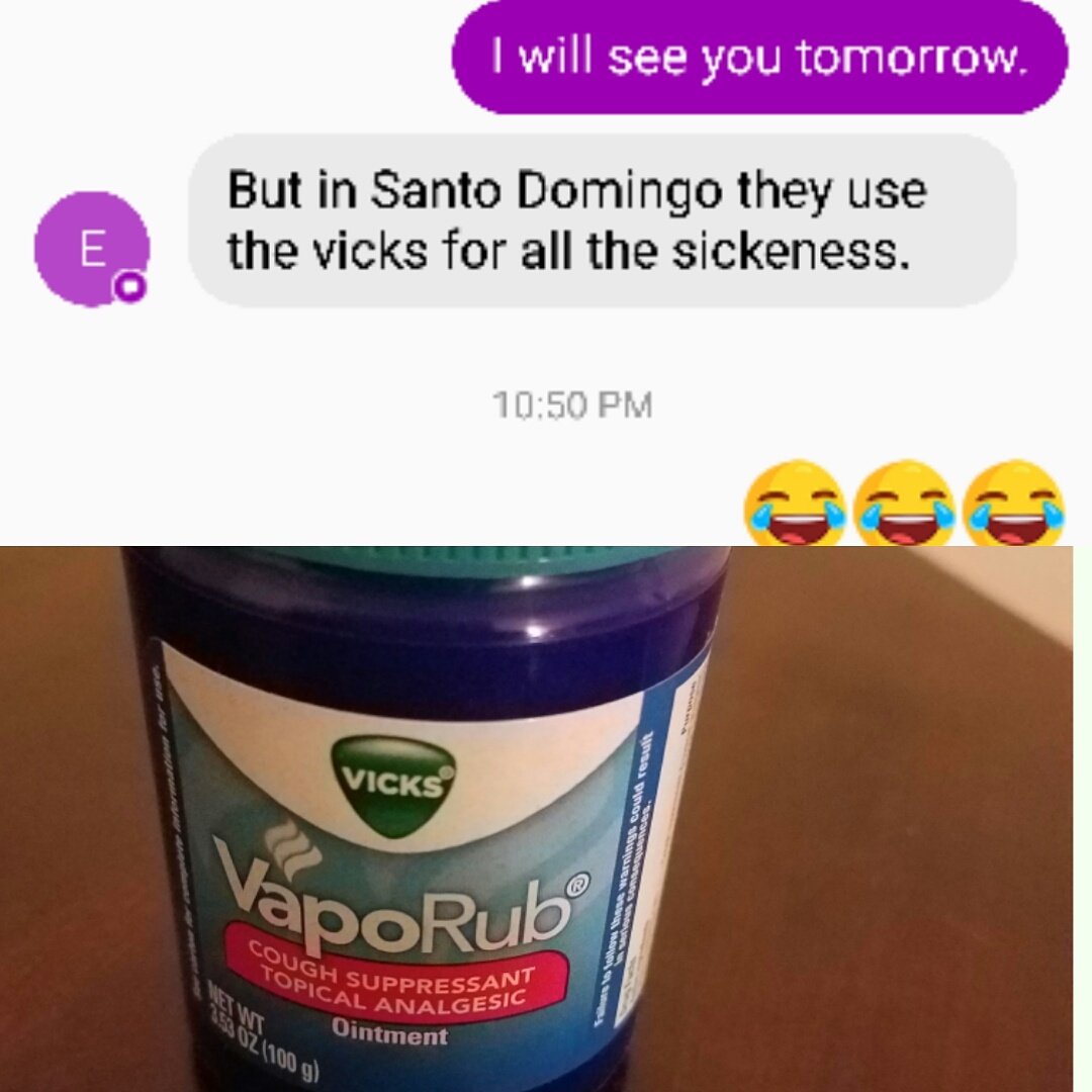 I thought my mom was unique until I realized the truth about Dominicans. It’s true that Vicks is the cure all for everything in the DR๐ …but hey it work!!!