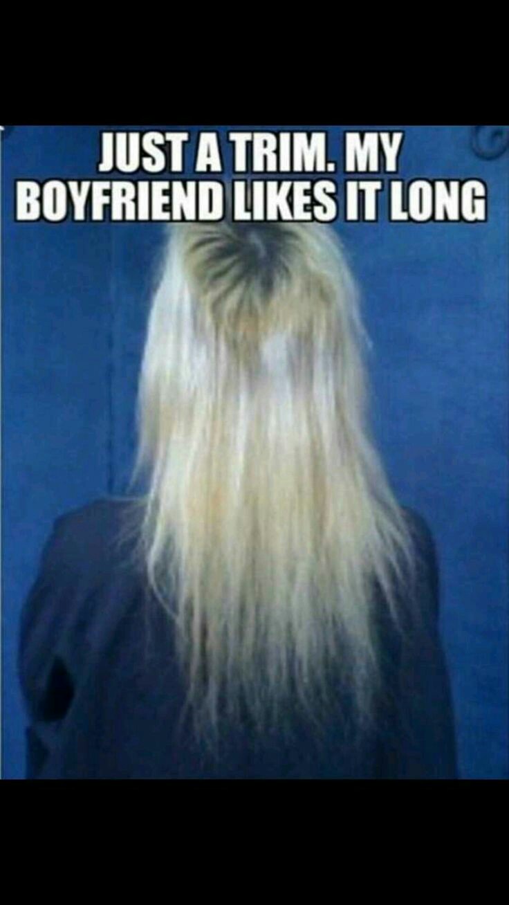 Ladies I understand your boyfriend likes long hair but you must keep it nicely trimmed you cannot walk around with broom hair.