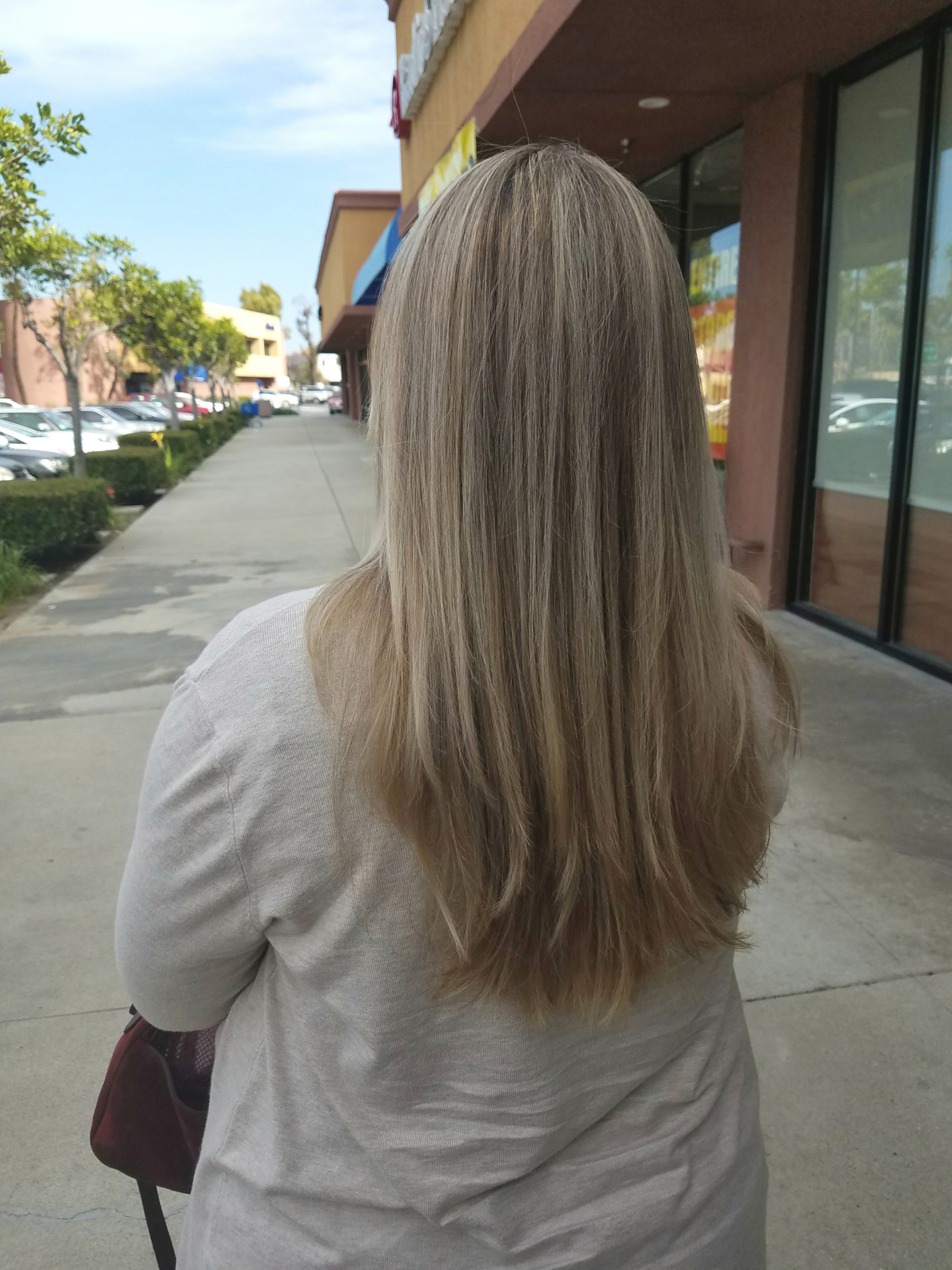 This a Holly’s hair in the outdoor lighting. Hair color looks completely different in outdoor and indoor lighting. Let me tell you taking hair pictures of hair is so much harder than doing the actual hair. There is no justice unless you use filters. I don’t like using filters on my hair color pictures as I feel like I’m cheating. Holly’s hair looked awesome when I was done but again you can’t tell the true colors on here. I’m going for the silver metalic hair color look on her. It’s the best color to blend your grays so when her hair grows out you don’t see the heavy line of demarcation. Non the less we were both happy with the hair color results..