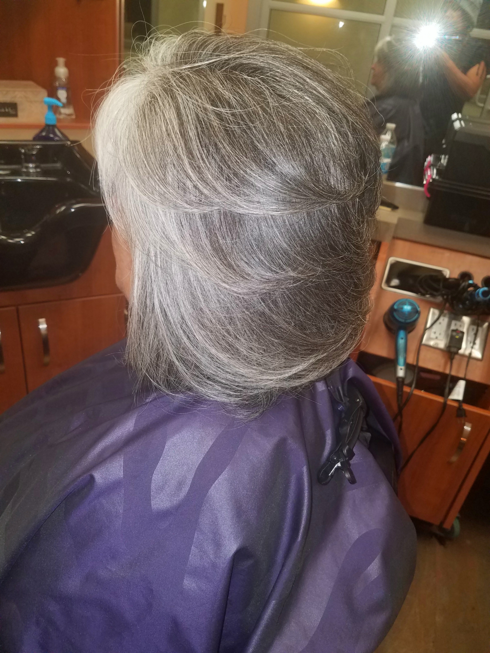 Who says gray hair can’t be fashionable. I cut and blowdried her hair last week.