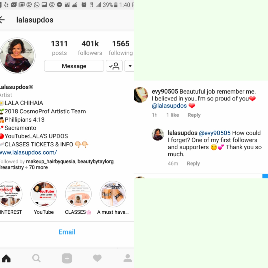 This is Lala I spoke about her before. When she first joined instagram and she a very small following. I discovered her by chance and saw on Instagram and saw one of her hair up do pictures. I told her that she was underrated and that one day she was going to blow up big. I took one of her pictures posted it on my wall and gave her shout outs. Sure enough someone discovered her, she has tons of followings now and is featured in magazines! She does amazing hair. This goes hand in hand with what I was talking about in my prior post. There is power behind words but first you must pay attention to how we think. Women should support each other..in fact humans should support each other period. You rise by lifting others up❤